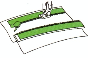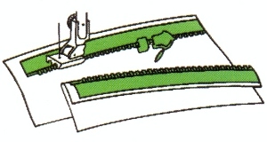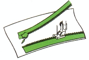 3. KORAK Dvignite tačko šivalnega stroja in premaknite drsnik in pomični spodnji končnik navzgor, na že zašiti del zadrge. Zadrgo potem zašijte do konca. |